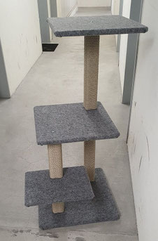 im Wohnzimmer stehen. Mit Höhle Liegemulde und zuoberst Liegebett gepolstert. Mit schwarzen Sisalsäulen, extra für draussen. Höhe 143 cm